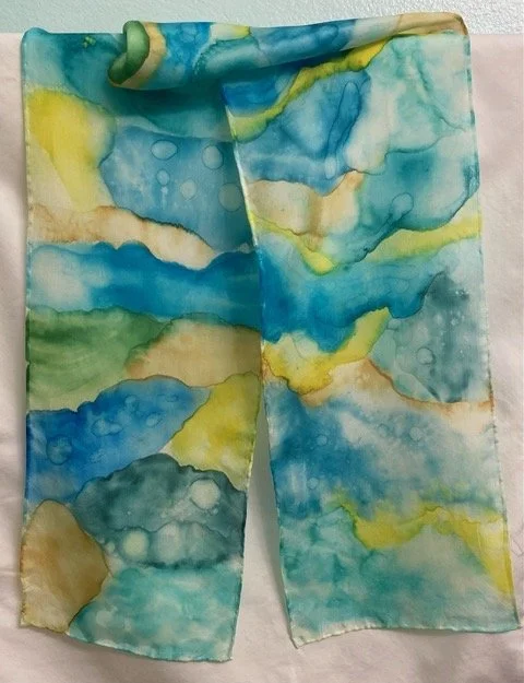 Recently I’ve started hand painting silk scarves using alcohol ink with stunning results. Each scarf is a unique, one-of-a- kind, true labor of love. My designs range from free flowing to floral patterns.